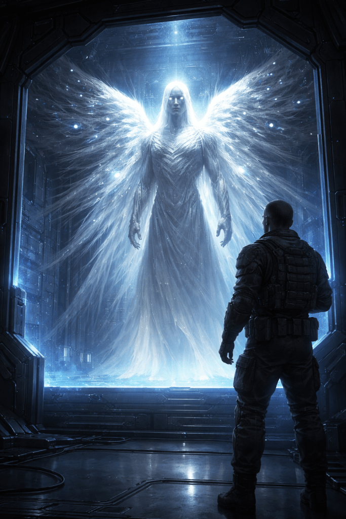 Sargent looked through his holofeed, and saw a pale ghastly form, tall and strong, much different from the creature he’d seen in the tube. The wings stretched at least two feet above its head, and the skin glowed luminescent. Whatever height the creature had was unlike any he’d had before. Far from the decrepit, and small creature he’d seen, the Angel grew in height and in girth.
