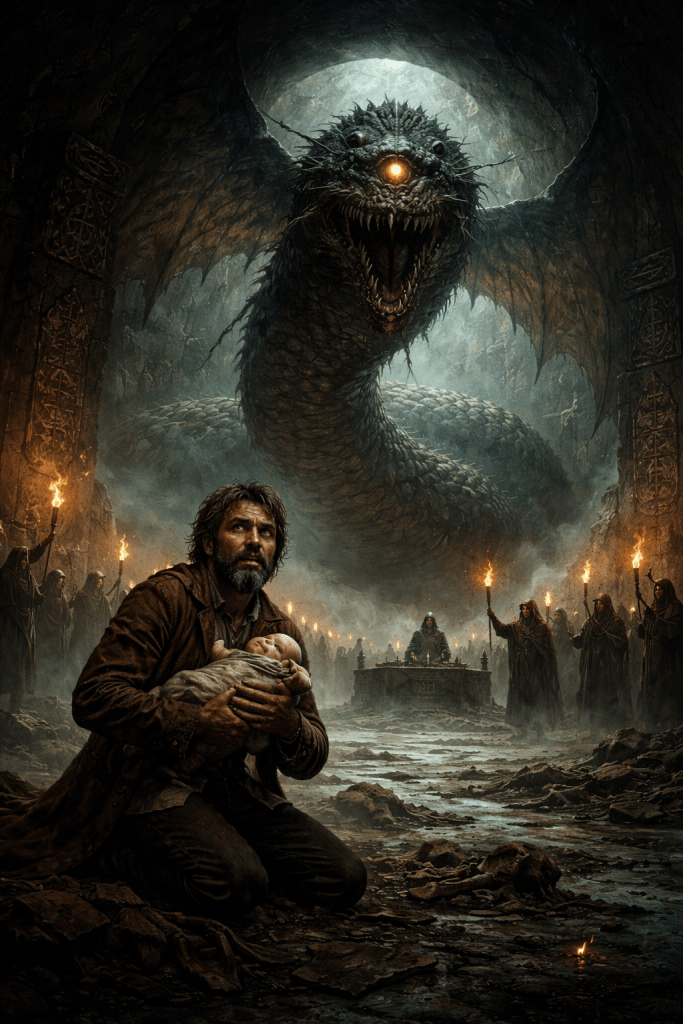 I uttered a swift prayer – one of desperation and partial lamentation to this unknown God of ages; that this winged serpent King Absalomos would spare my son for me, and that I might take his place.