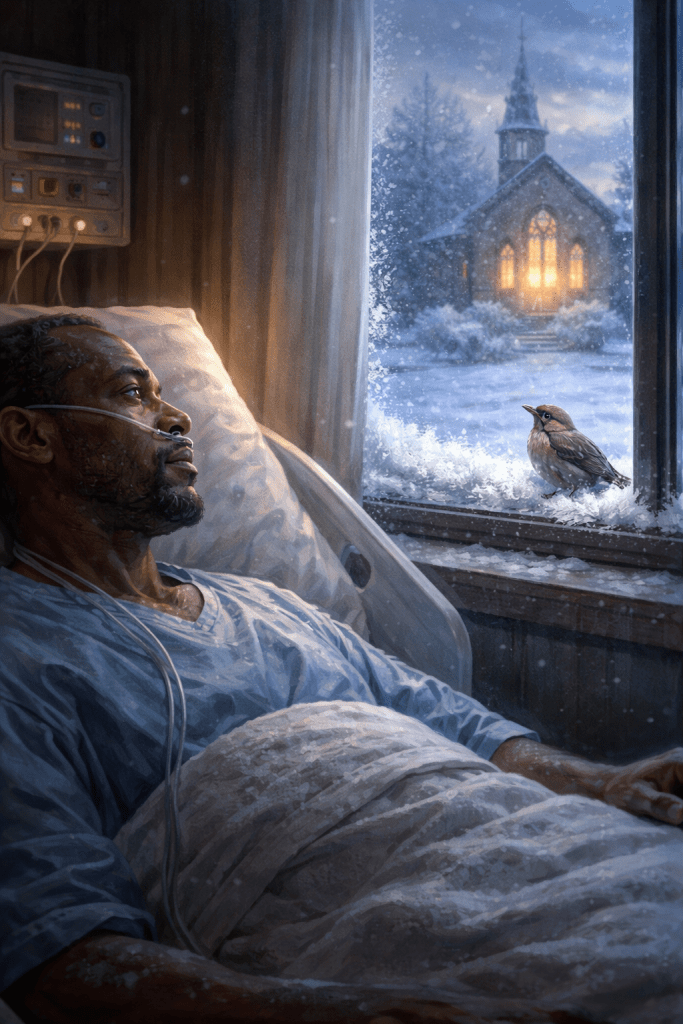 His eyes open before the storm. Outside the snow falls like cotton down, and the lights of distant cars meander near the base of the Veteran’s hospital.